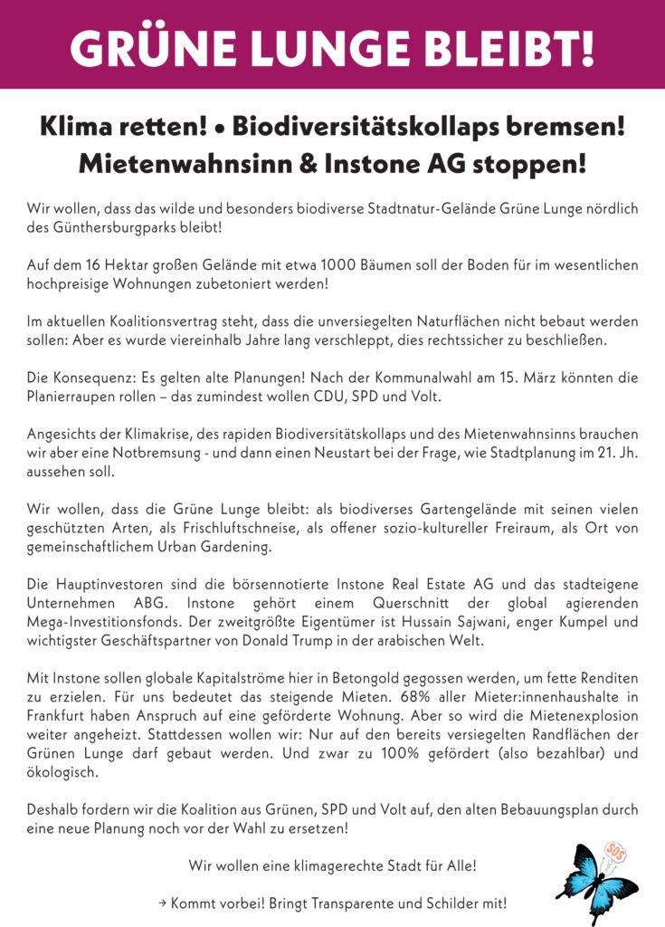 Anlässlich des Neujahrsempfangs der Stadt Frankfurt demonstrieren wir für den Erhalt des wilden, biodiversen Stadtnatur-Areals nördlich des Günthersburgparks, namens Grüne Lunge.